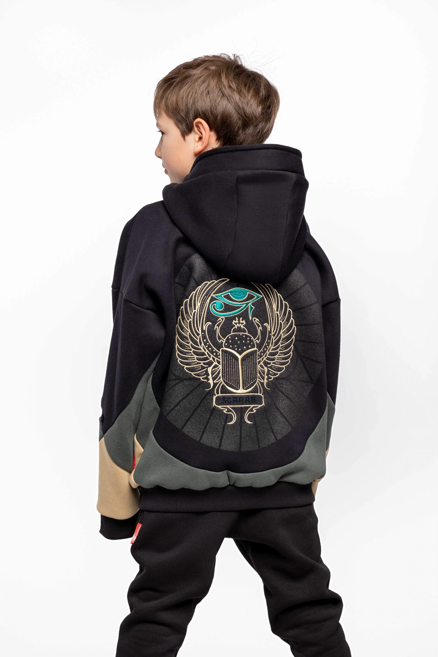 На спині дитячого теплого худі розташовано принт з вишивкою у вигляди сакрального скарабея. На правому рукаві шеврон “the world’s smallest airlines”. На грудях зліва вишивка “Telesyk airlines”. Зроблена з якісних матеріалів і приємна до тіла. Вставки на рукавах імітують лапки жука.
