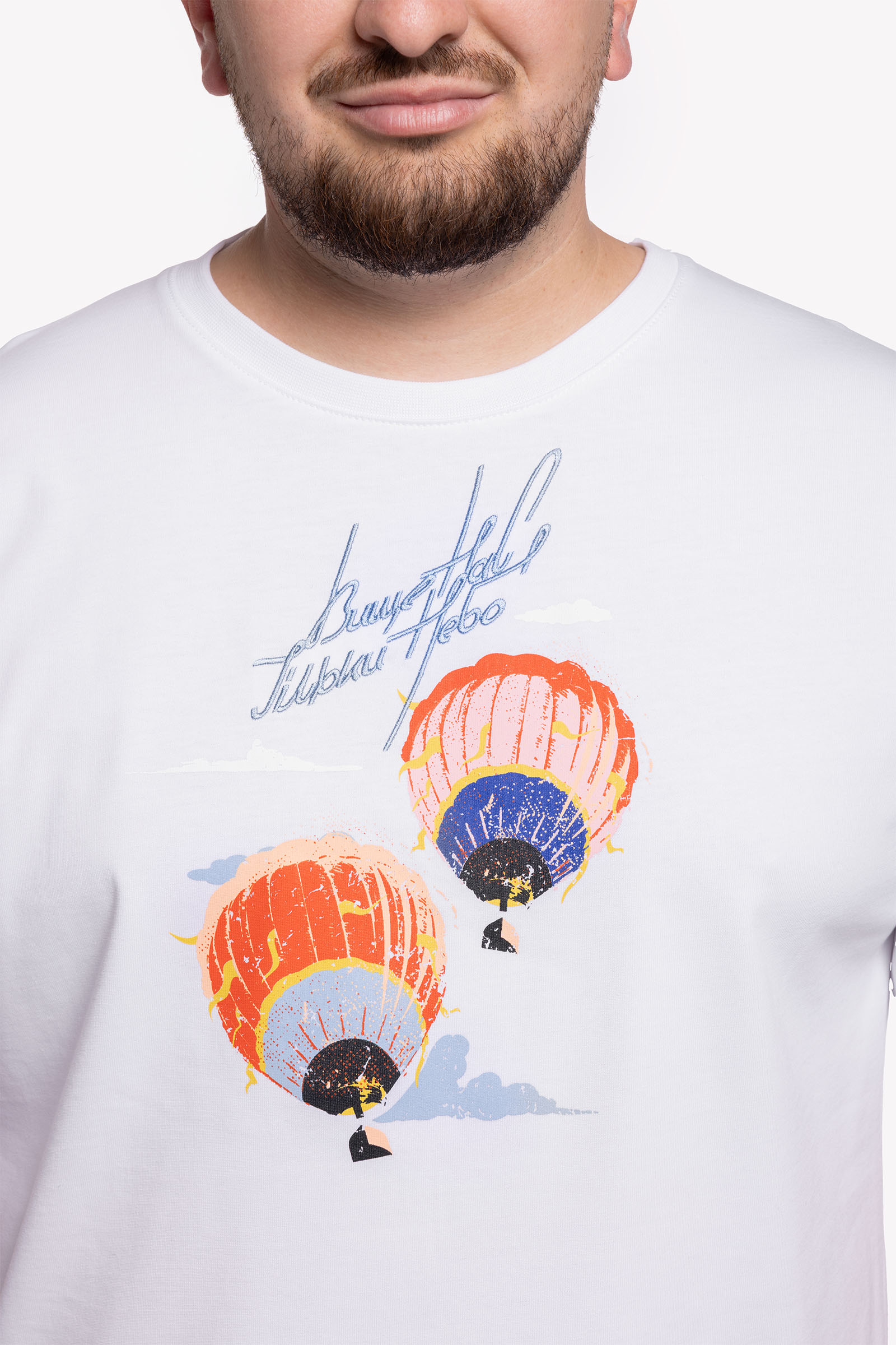 Imagine that weightless feeling of flight — when the sky is clear, colorful hot air balloons float around you, and joy fills your soul at the sight. The white men’s T-shirt “Aeronauts” captures exactly that mood.