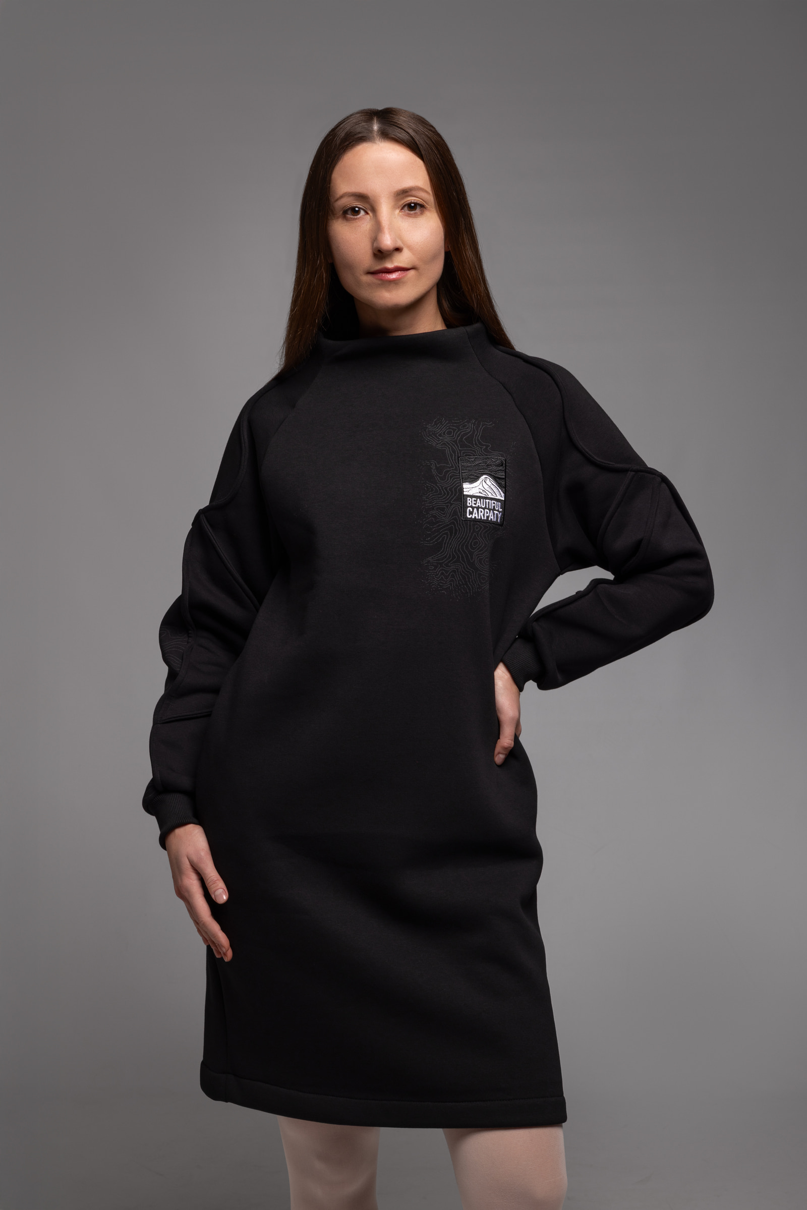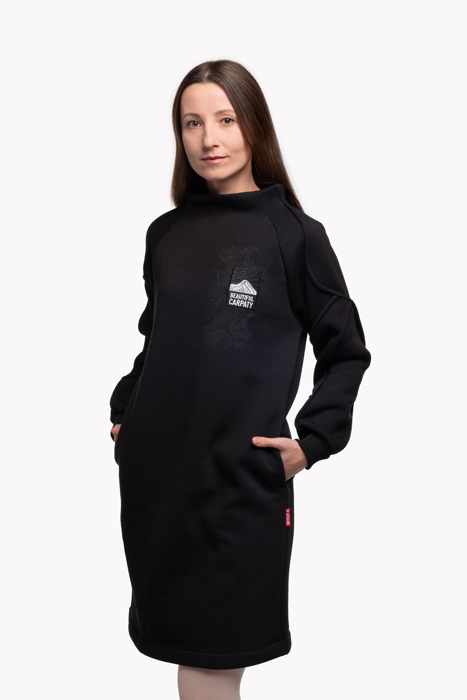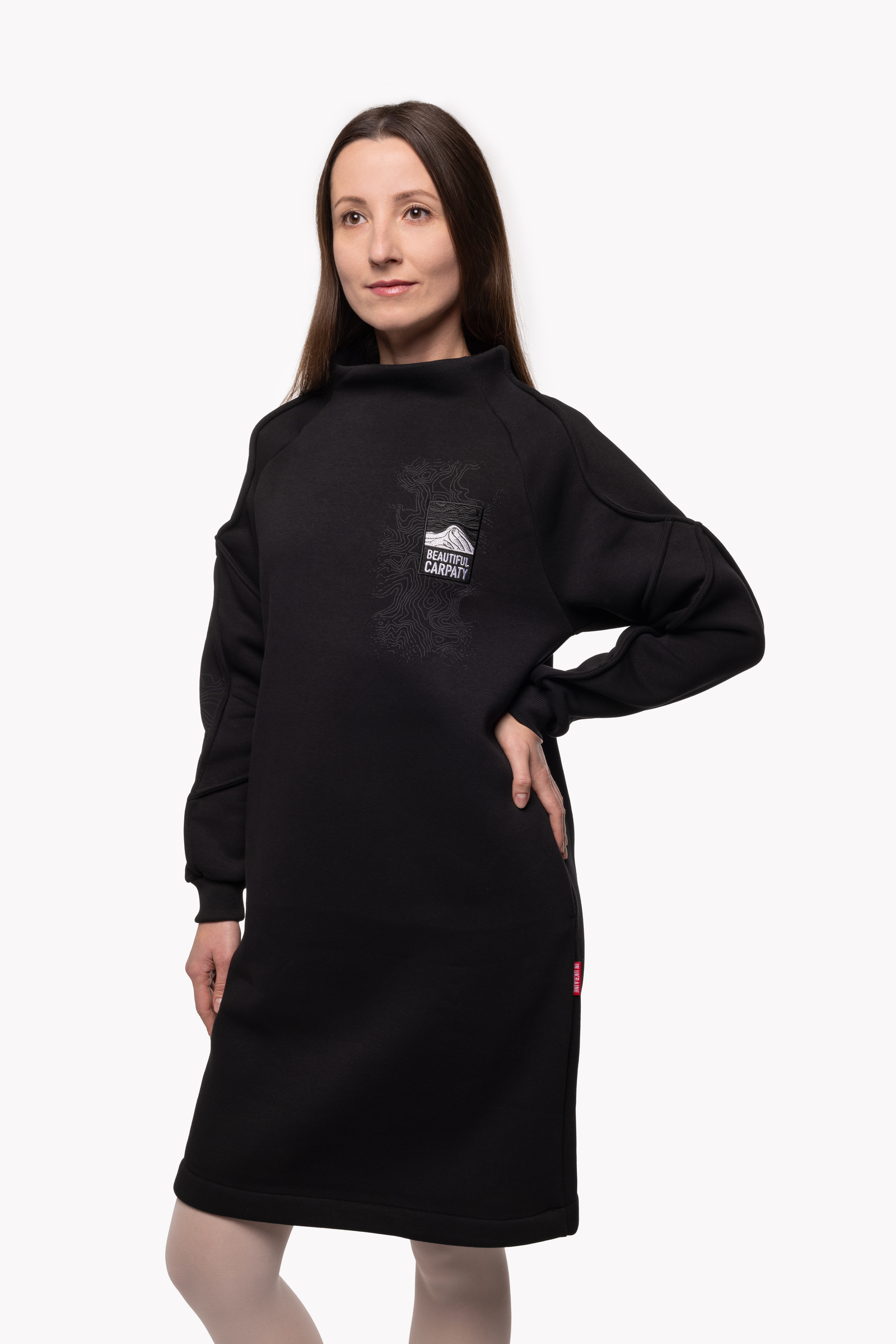 І в ці холодні сезони, щоб ви також гарно вбиралися та почувалися затишно, ми пошили для вас цю вдяганку. Тепла жіноча сукня зроблена з міцної бавовняної тканини, а всередині – м’який фліс. Спереду та на рукаві ми зобразили карпатський рельєф. А на спині – чорногірський хребет з його норовливими вершинами, та вишитий логотип Авіації Галичини, аби ви завжди відчували крила за плечима.