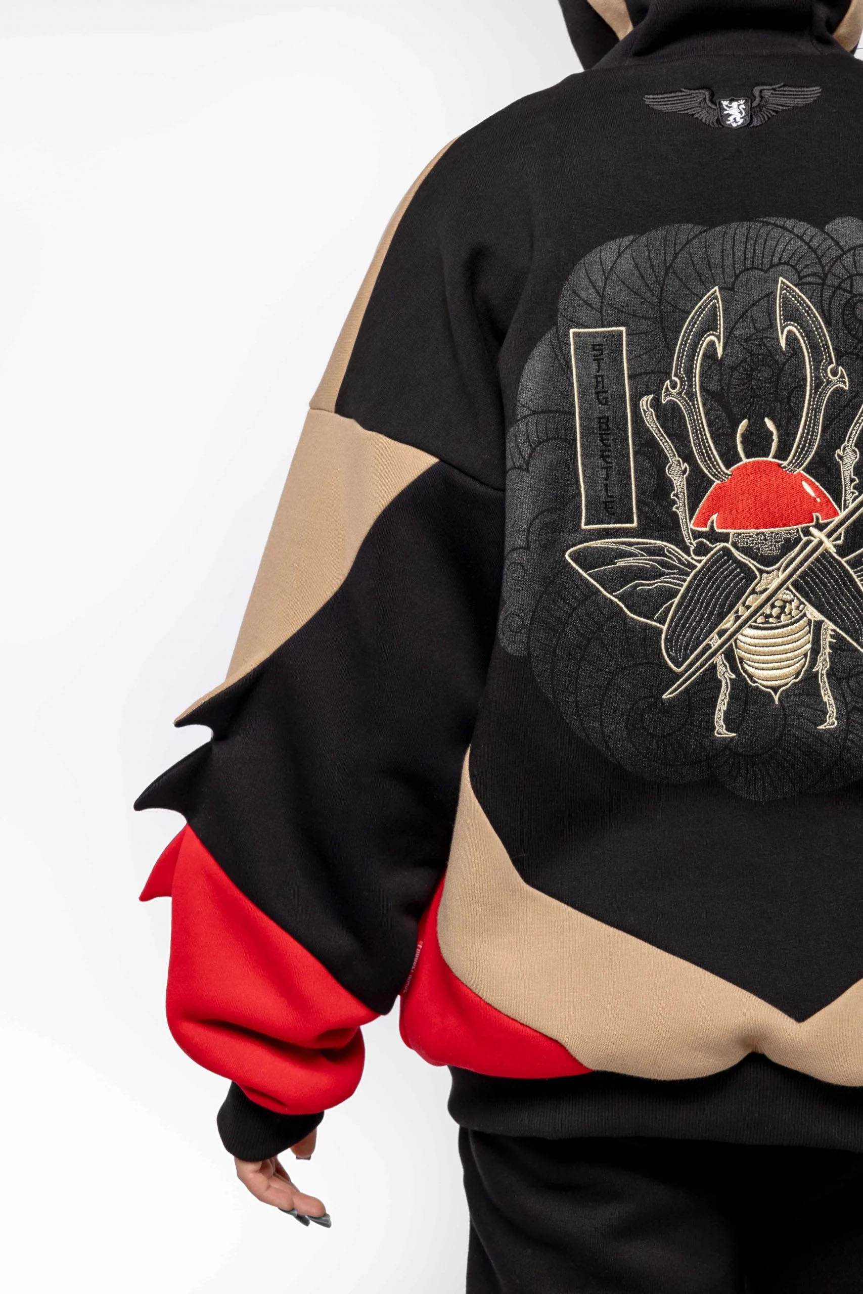 This warm women’s hoodie has a print on the back with an embroidered stag beetle samurai. The right sleeve has “The world’s smallest airlines” chevron. On the chest, there is an embroidery “Telesyk airlines” on the left. Inserts on the hood imitate beetle’s legs.
