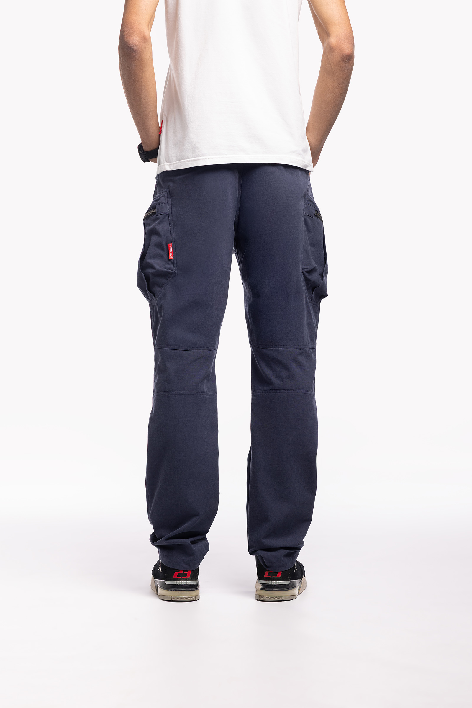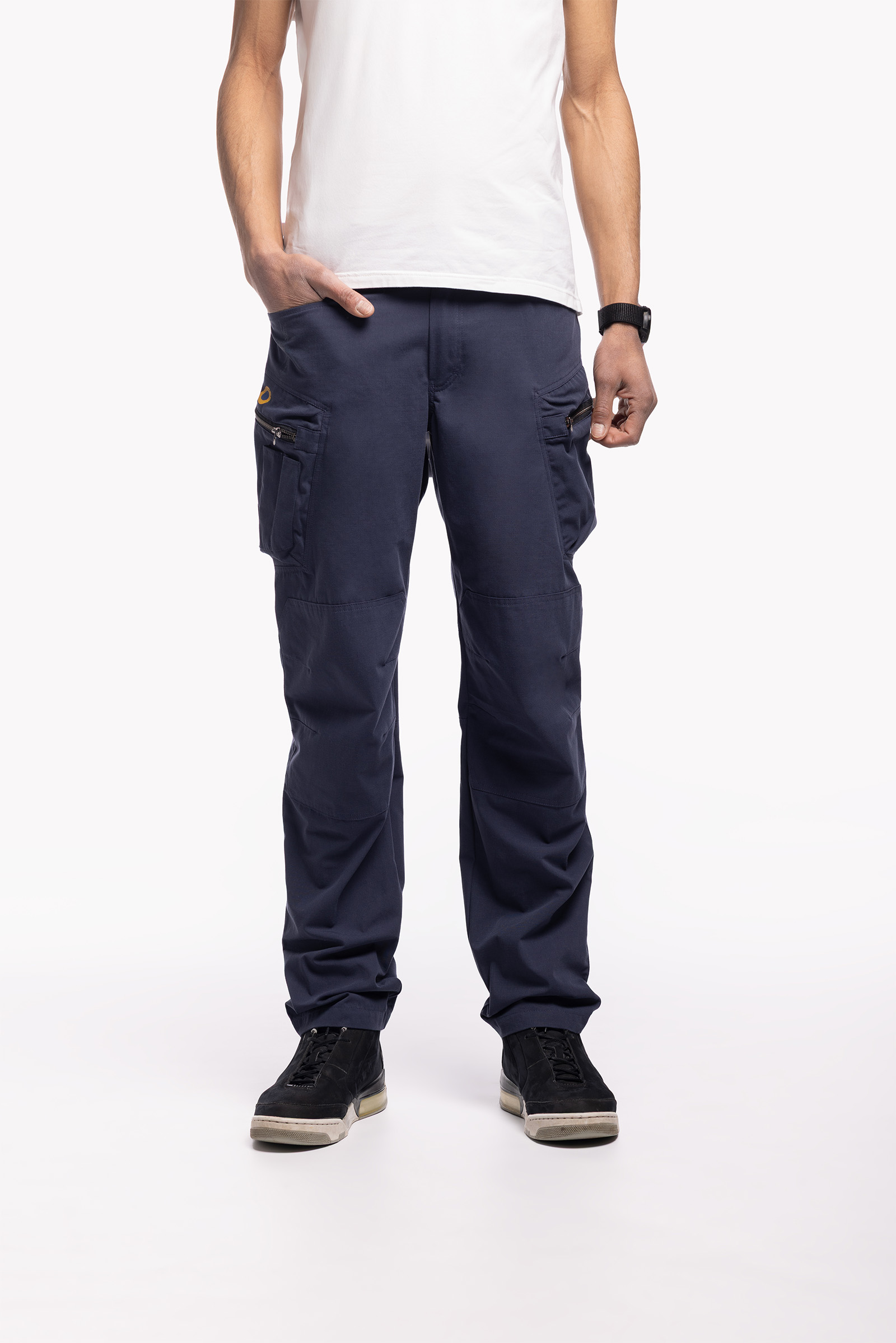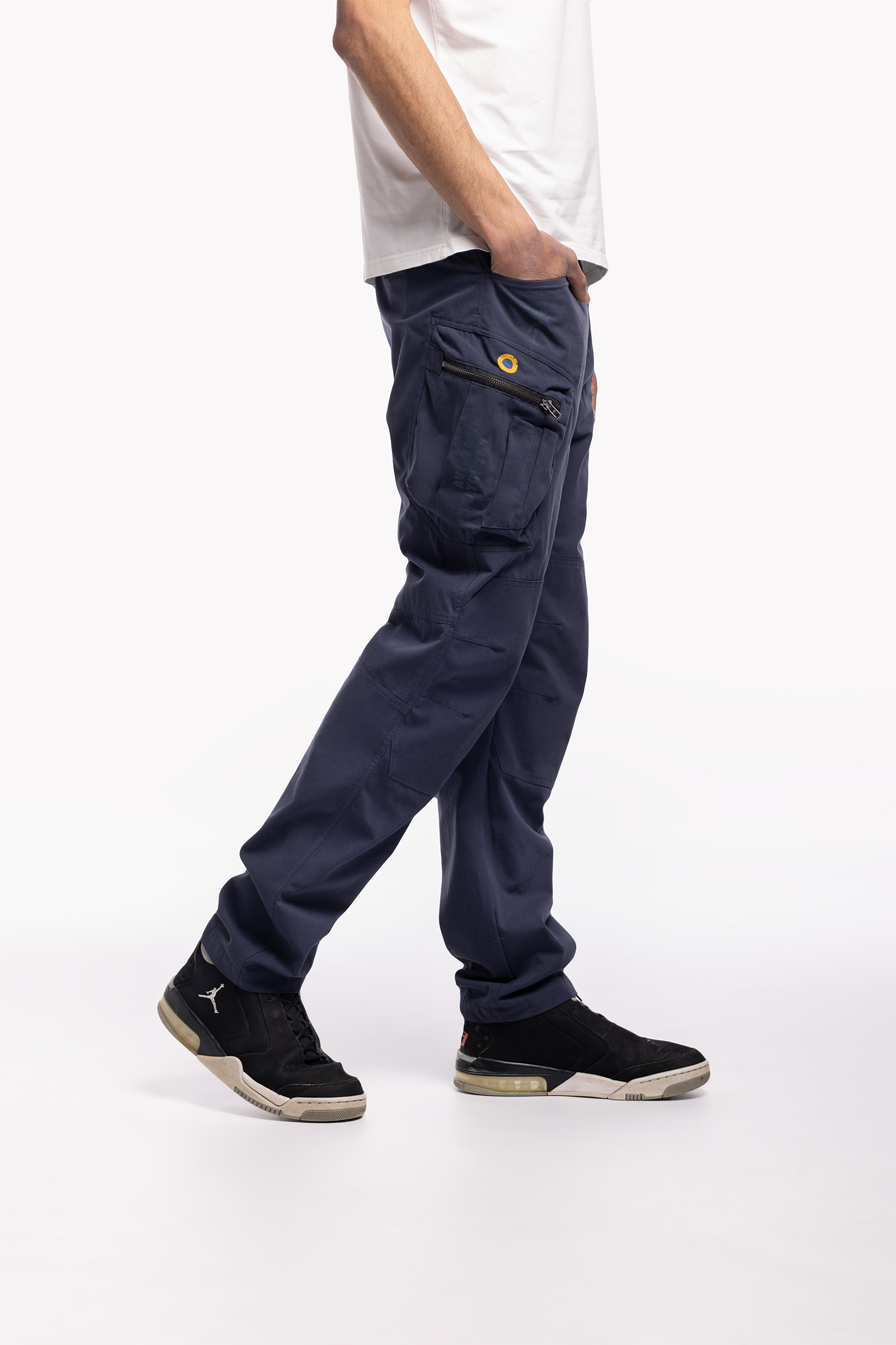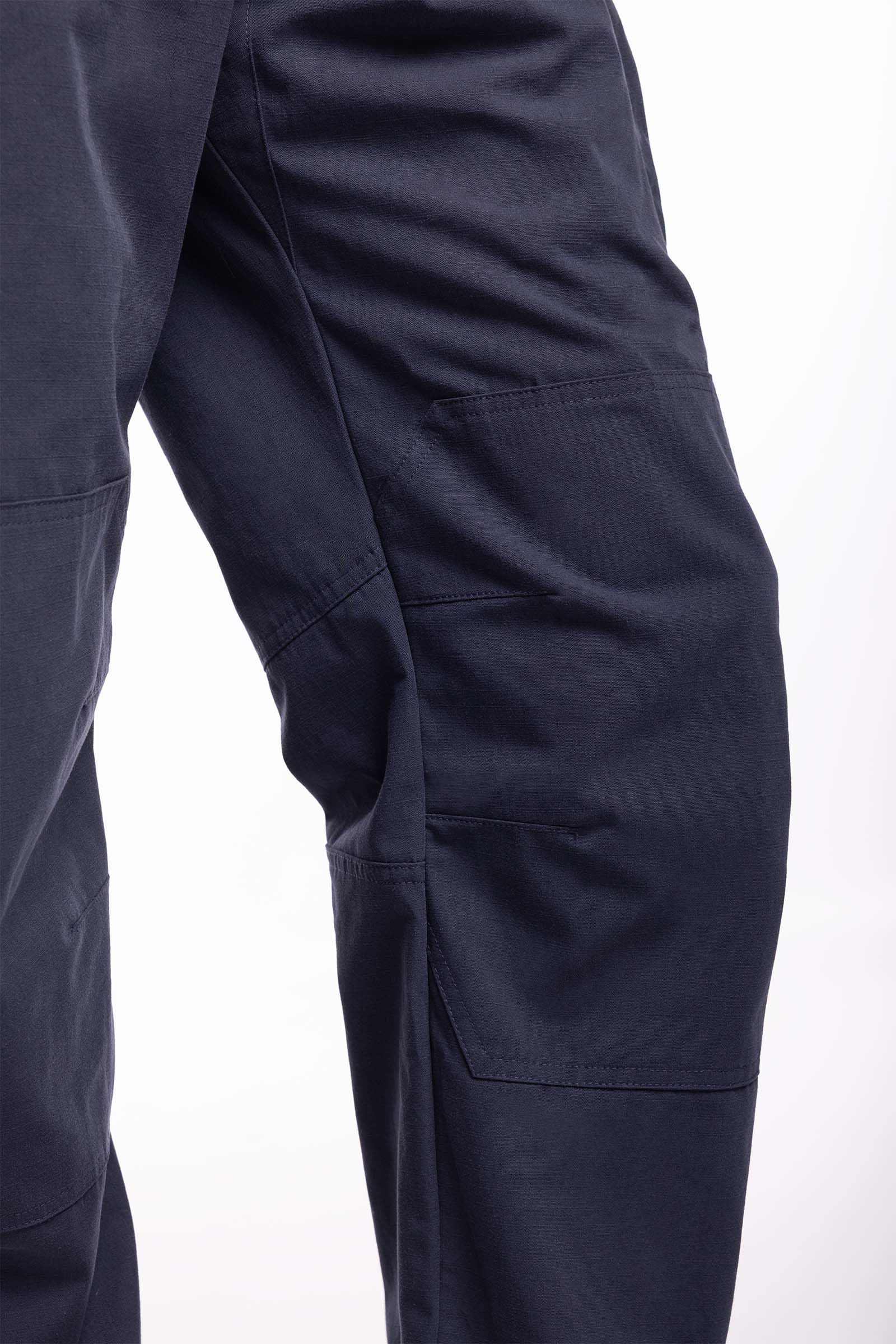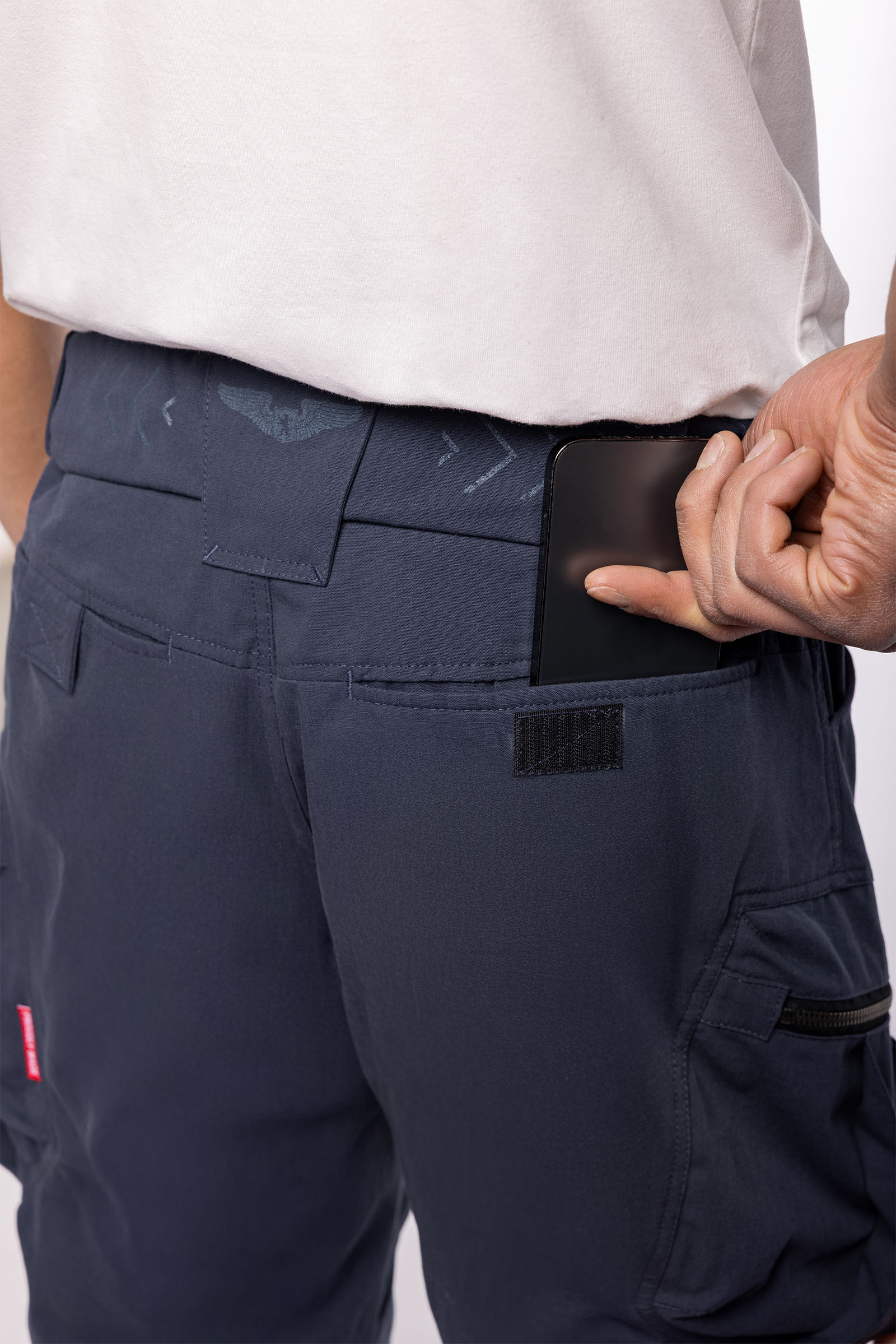 Штани мають підсилювачі на колінах, нашиті таким чином, аби виточки дозволяти коліну вільно згинатися і не обмежували рухи. Ми зробили тут мінімум (за нашими мірками) кишень – всього 6. Спереду глибокі приховані: їхня особливість у тому, що середина пошита не з бавовни, як зазвичай, а з тканини ріп-стоп, тому про халепи з дірками у кишенях можна забути – тут все надійно. Трохи нижче штани мають дві акцентні та функціональні кишені. Аби зберегти стриманість форм, ми зробили їх не накладними, як у карго, а вшитими у самі штани. Задні кишені ми зробили максимально місткими й глибокими, але заховали їх в шов та додали стримані маленькі липучки, аби не перевантажувати штани деталями, й при цьому зберегти функціональність.