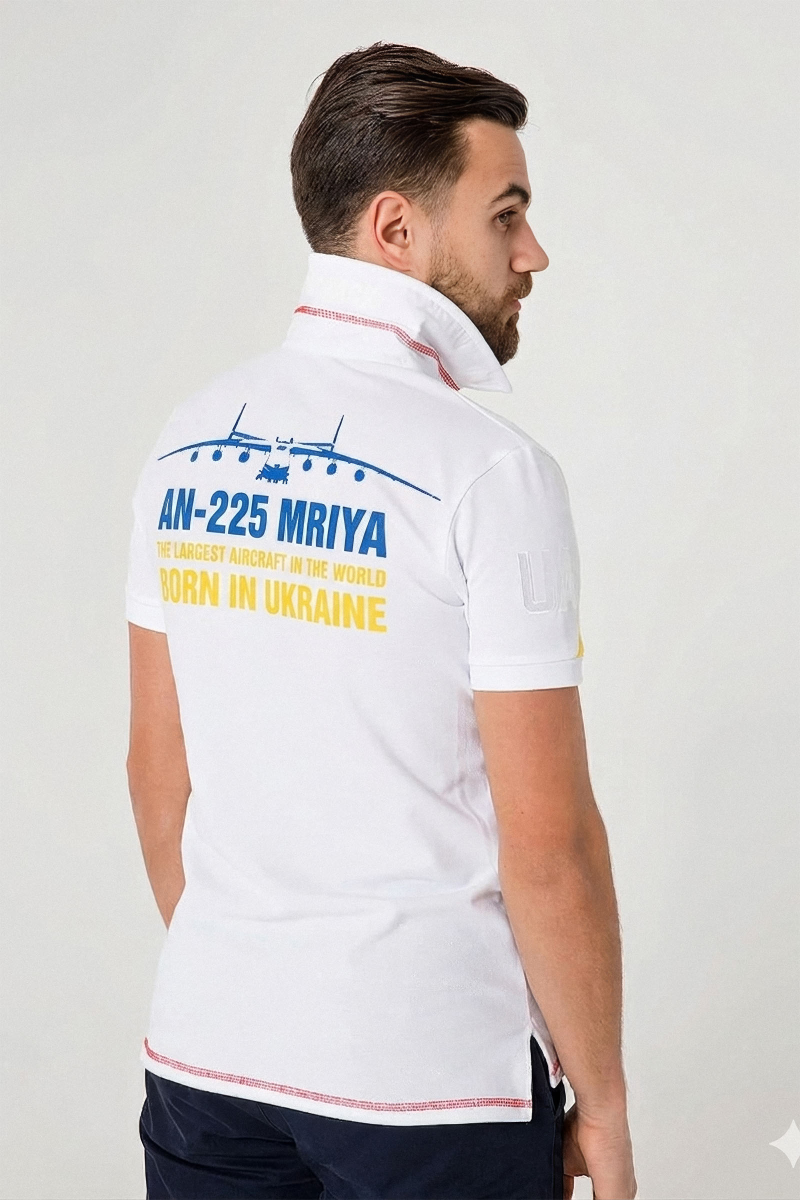 Спину прикрашає друковане зображення літака в повітрі та напис: “Largest aircraft in the world born in Ukraine”.