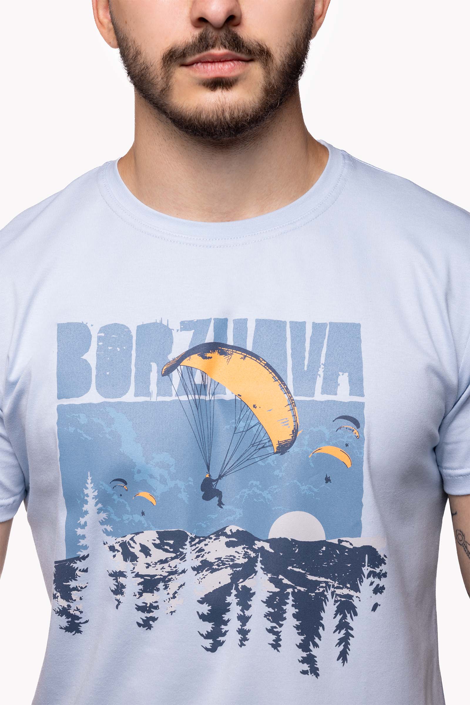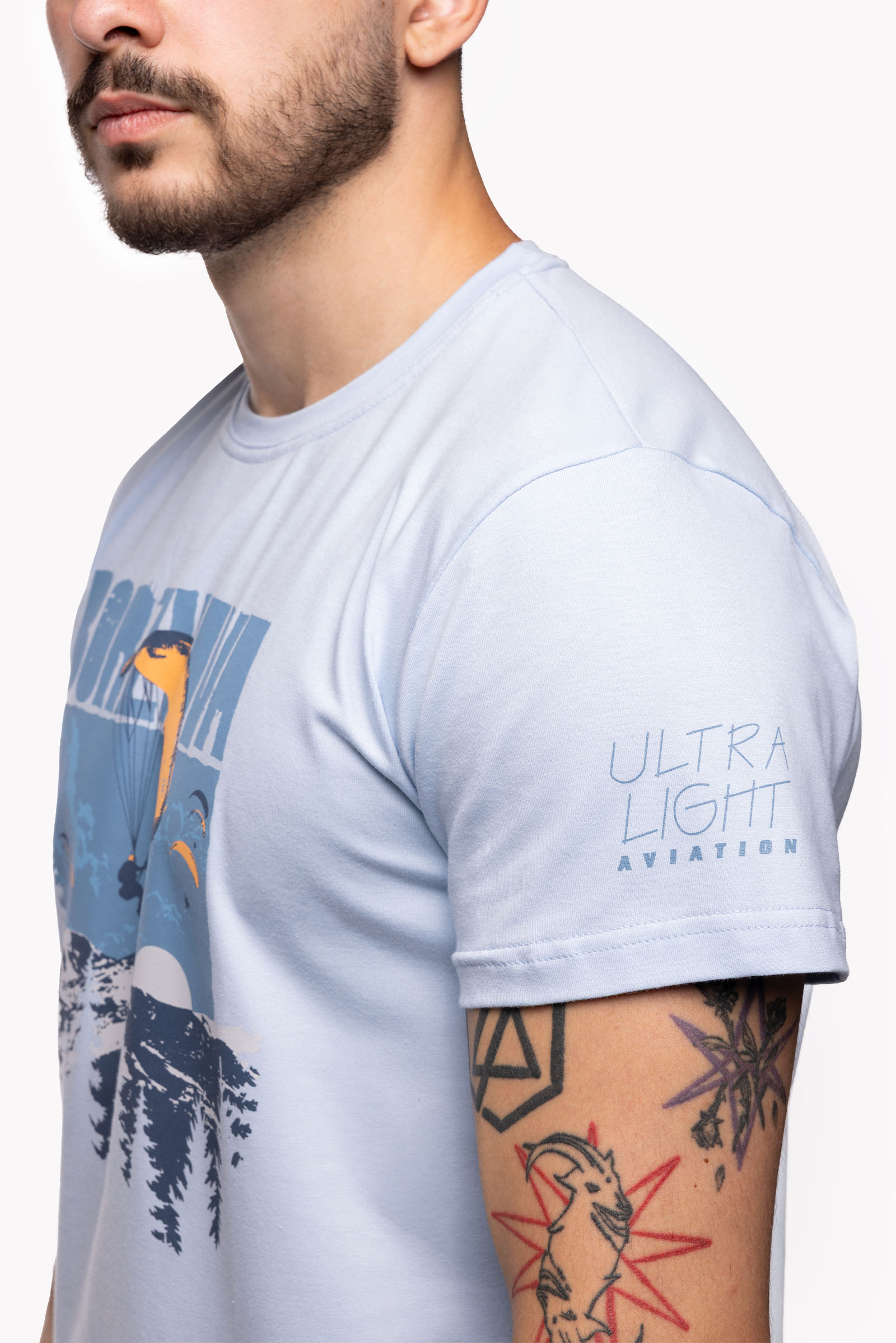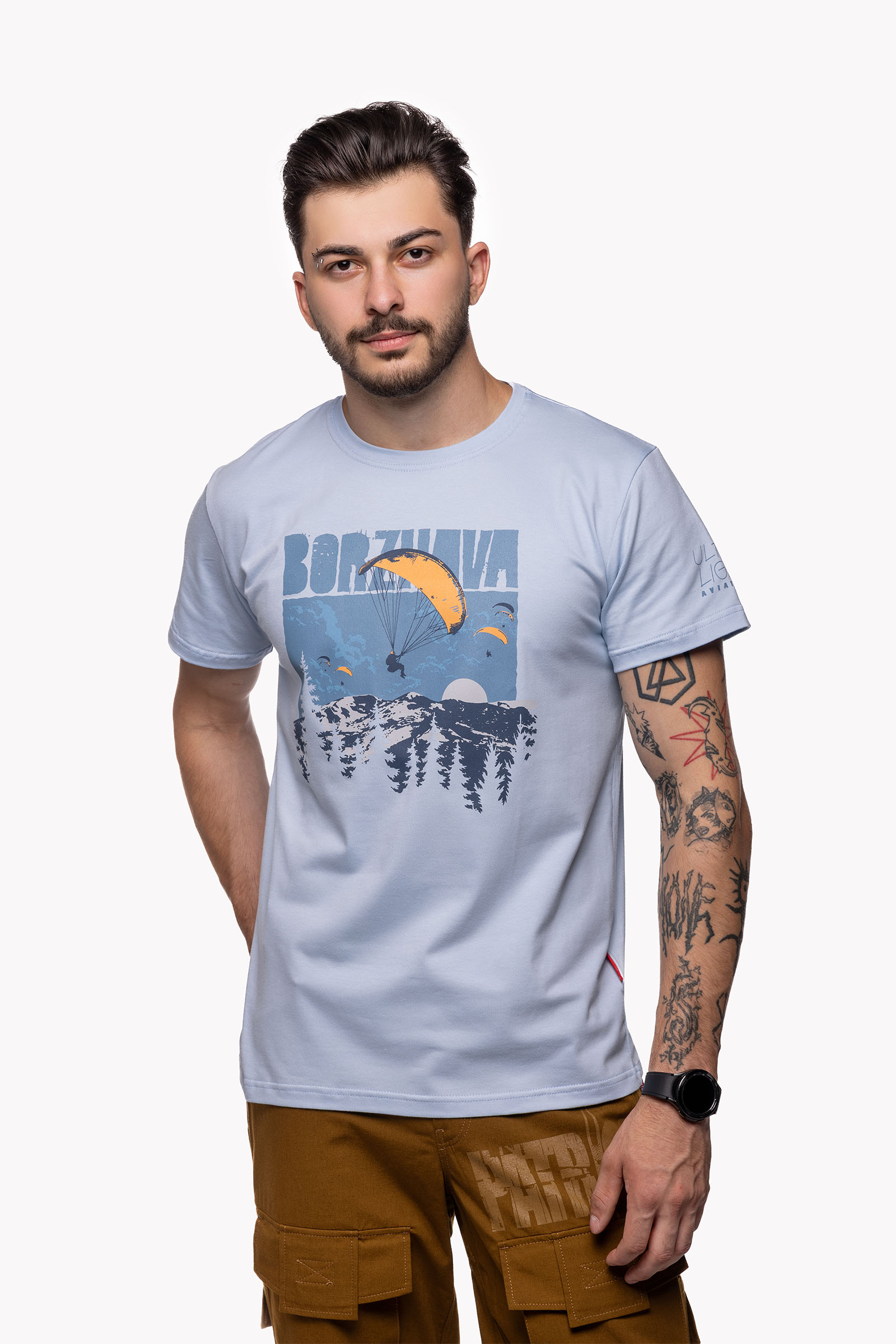 Футболка про гори, небо і про тих, хто вміє майстерно між тим усім балансувати! А якщо зовсім точно, то це є історія про парапланеристів та їхнє природне середовище — гірський масив Боржава, де в мирні часи традиційно проводився Paragliding Carpathian Cup. Має ніжний блакитний колір, би те відчуття польоту в чистому небі не покидало в будь-яких обставинах. На грудях — принт з зображенням Боржави та парапланеристами, що ніби танцюють у повітрі над її вершинами. На рукаві — принтований напис Ultra Light Aviation.