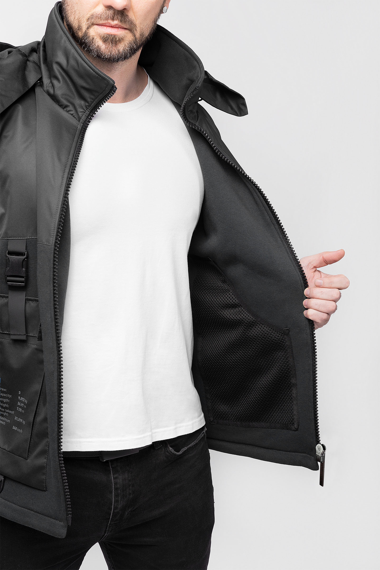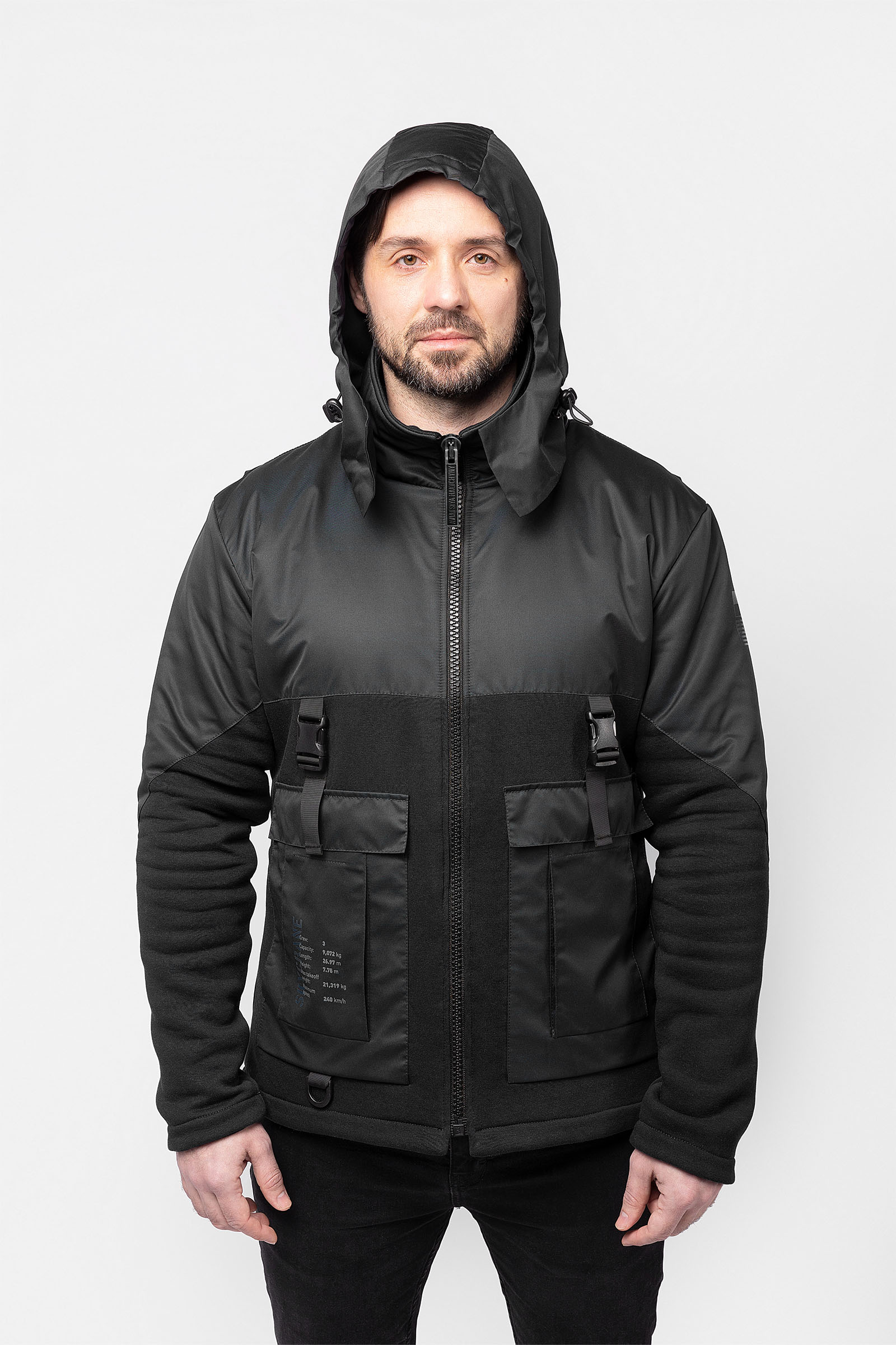 Bluza jest dość zgrabna, choć nie można powiedzieć, że jest minimalistyczna. Ramiona, kołnierz, rękawy i plecy są wzmocnione od wewnątrz nylonowymi wstawkami. Posiada również lekki kaptur ze sznurkami ściągającymi, który jest starannie schowany w kołnierzu. Z przodu znajduje się sześć funkcjonalnych kieszeni z ozdobnymi opaskami u góry. Na dole lewej kieszeni znajduje się kółko do zaczepienia karabinka z kluczami. Ze środka znajdują się jeszcze dwie pojemne kieszenie wykonane z dość szczelnej siatki. Szwy są wzmocnione taśmą twillową dla dodatkowego przymocowania. Można bezpiecznie umieścić telefon lub portfel, a nawet butelkę wody i nie martwić się.