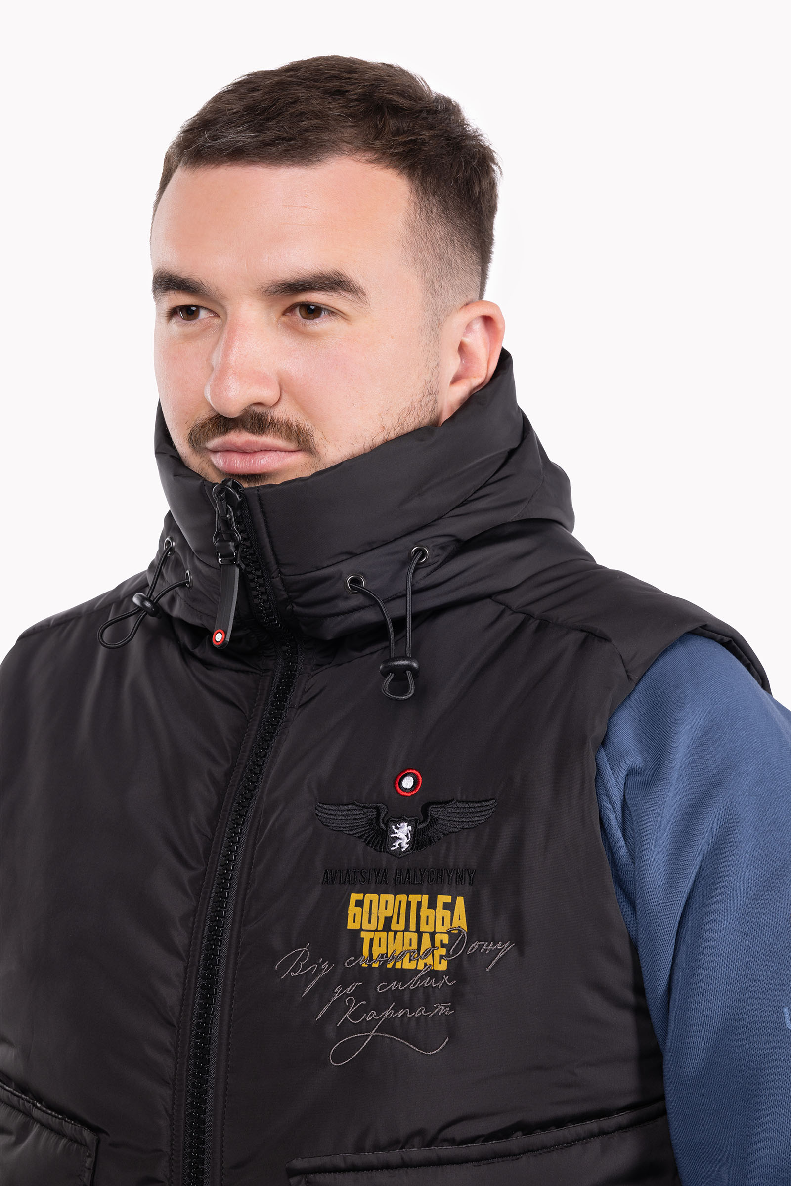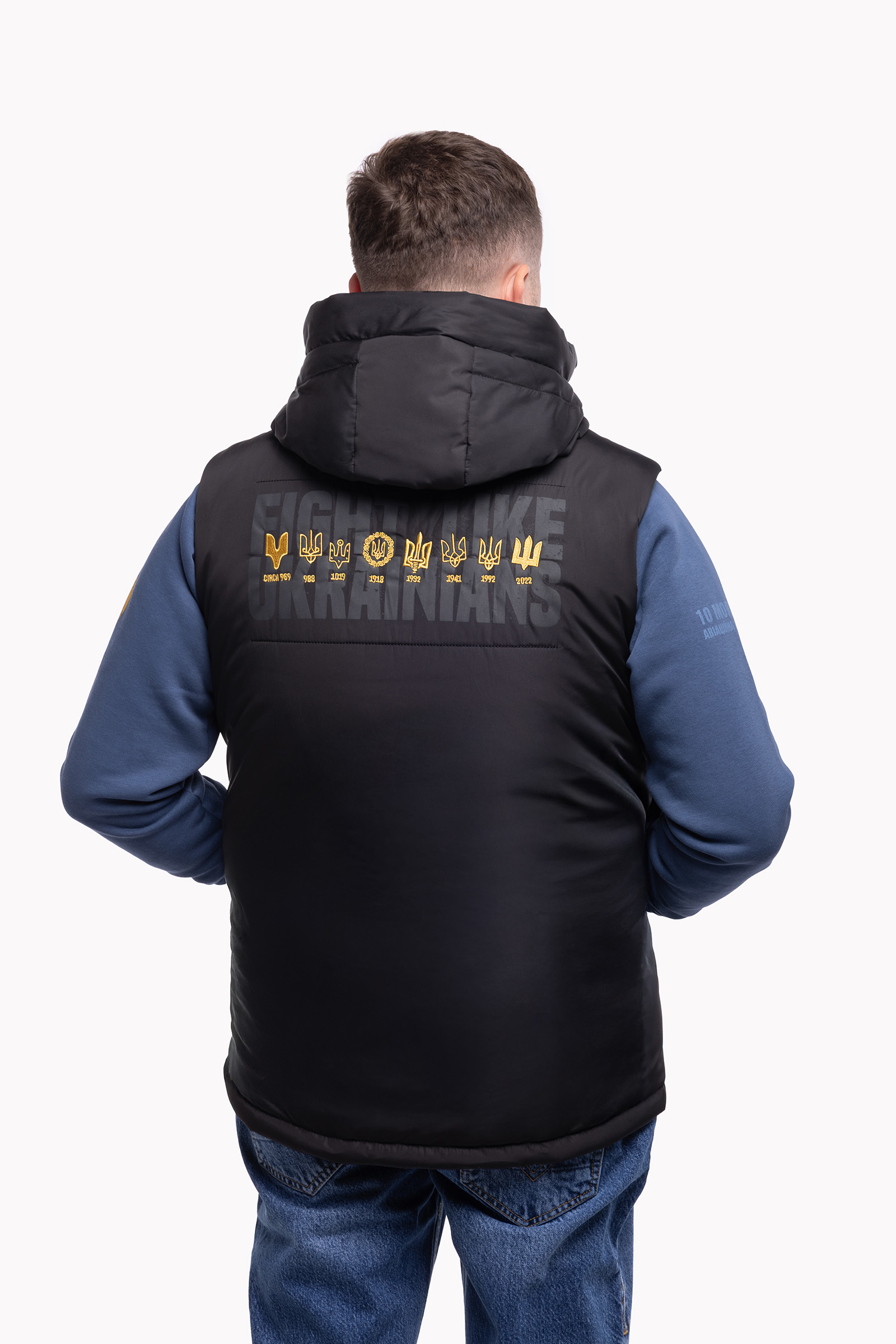 Od błękitnego Donu po siwe Karpaty rozciąga się nasza malownicza Ukraina, która przeszła wiele prób, ale zawsze odradzała się z nową siłą. Przez wieki Tryzub (ukraiński trójząb) pozostawał głównym symbolem państwowości Ukrainy — uosabiając wolność, niepodległość i jedność narodu. Na tej męskiej kurtce bez rękawów trójząb przedstawiony jest w różnych okresach historycznych, przypominając, że walka o wolność trwa.