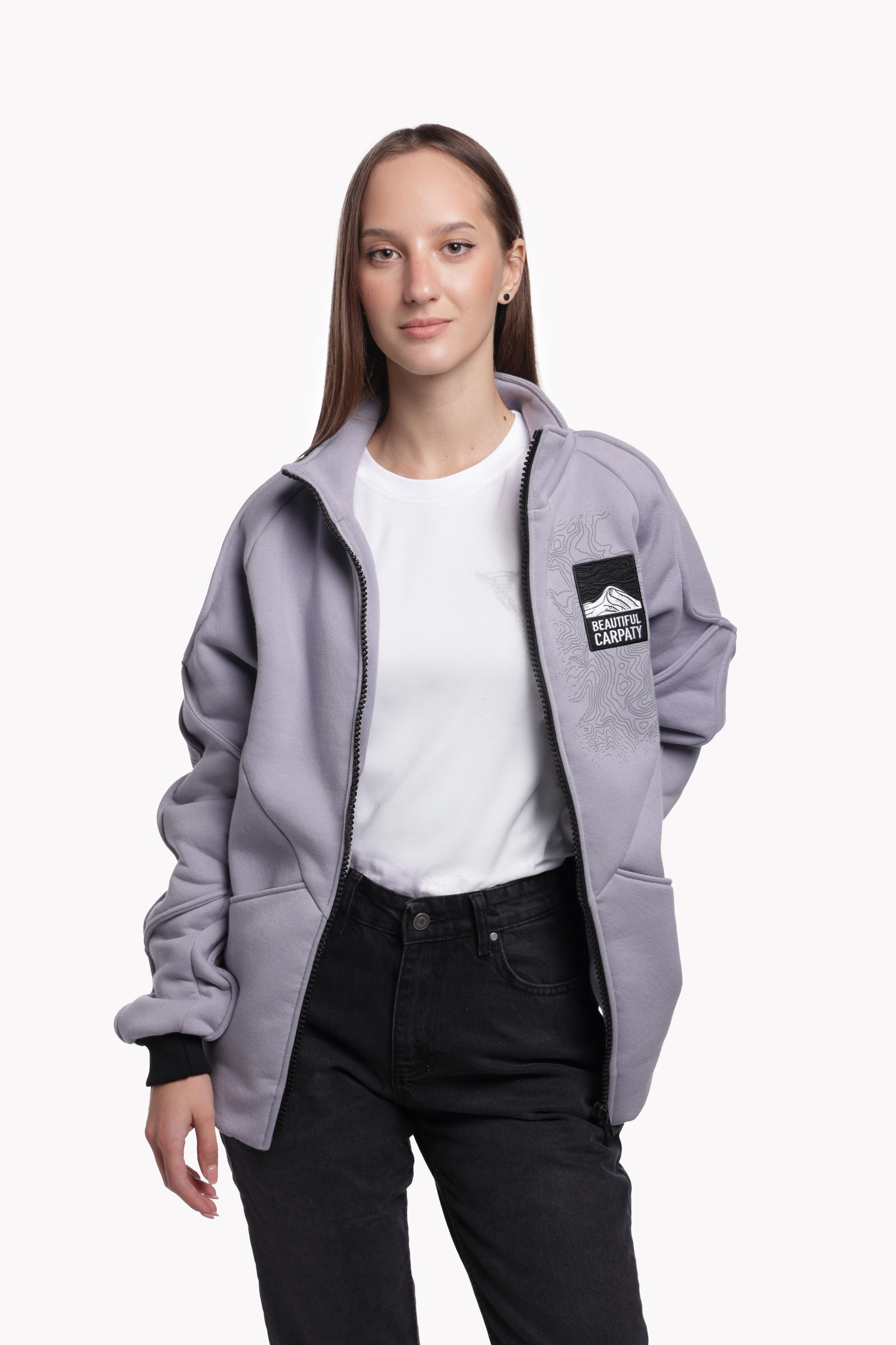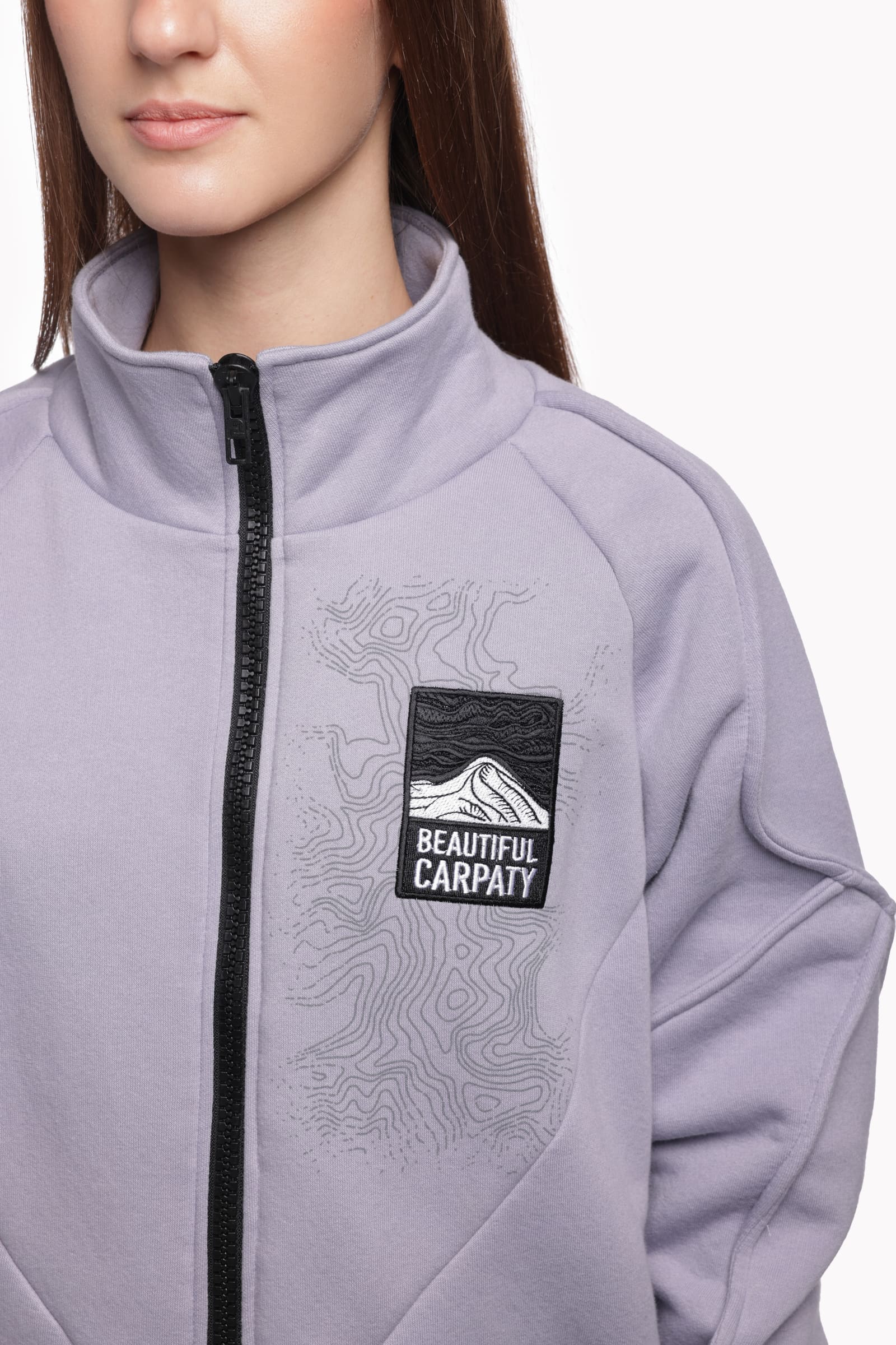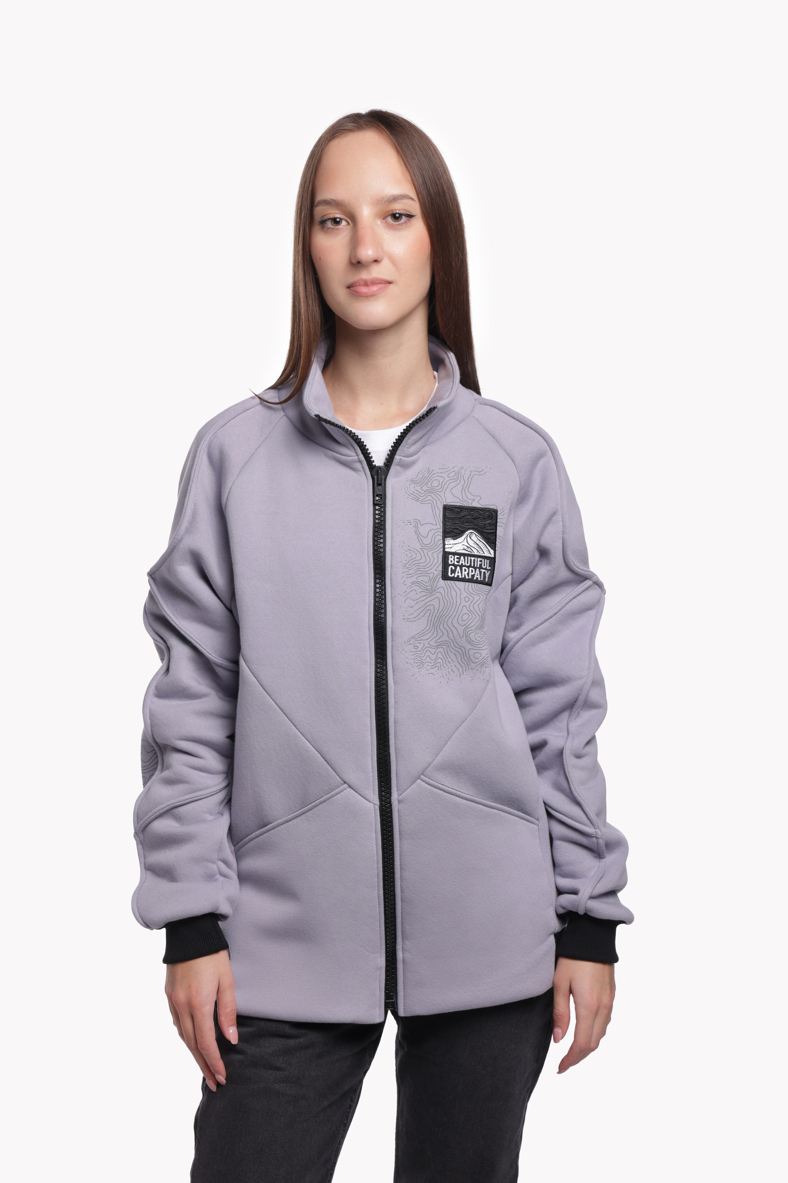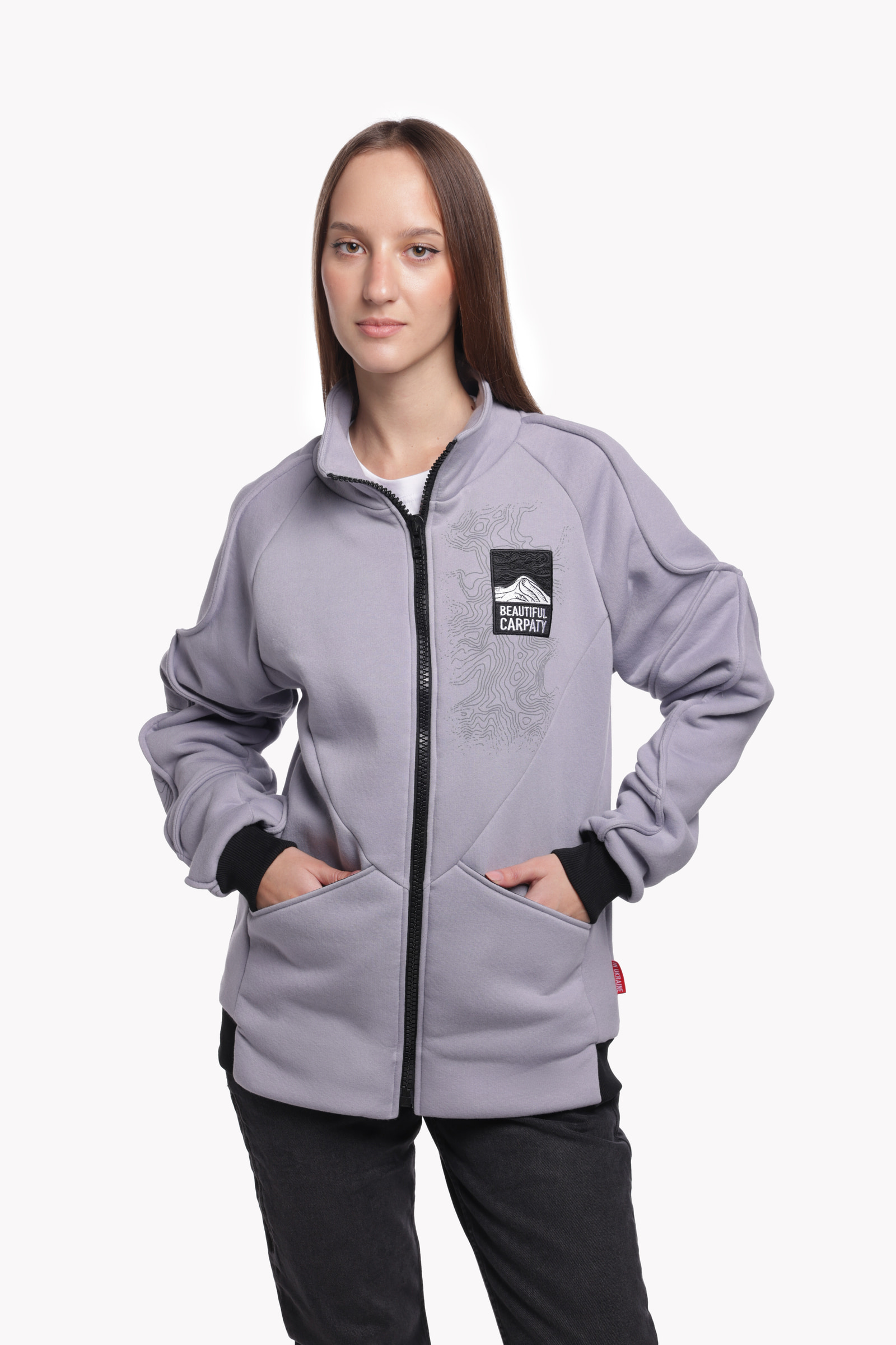 Z tyłu — masywny nadruk pasma Czarnohory. Z przodu — mapa z konturami i naszywka Beautiful Carpaty. Dodatkowo: wygodne kieszenie na dłonie oraz wysoki kołnierz, który chroni przed zimnymi powiewami.