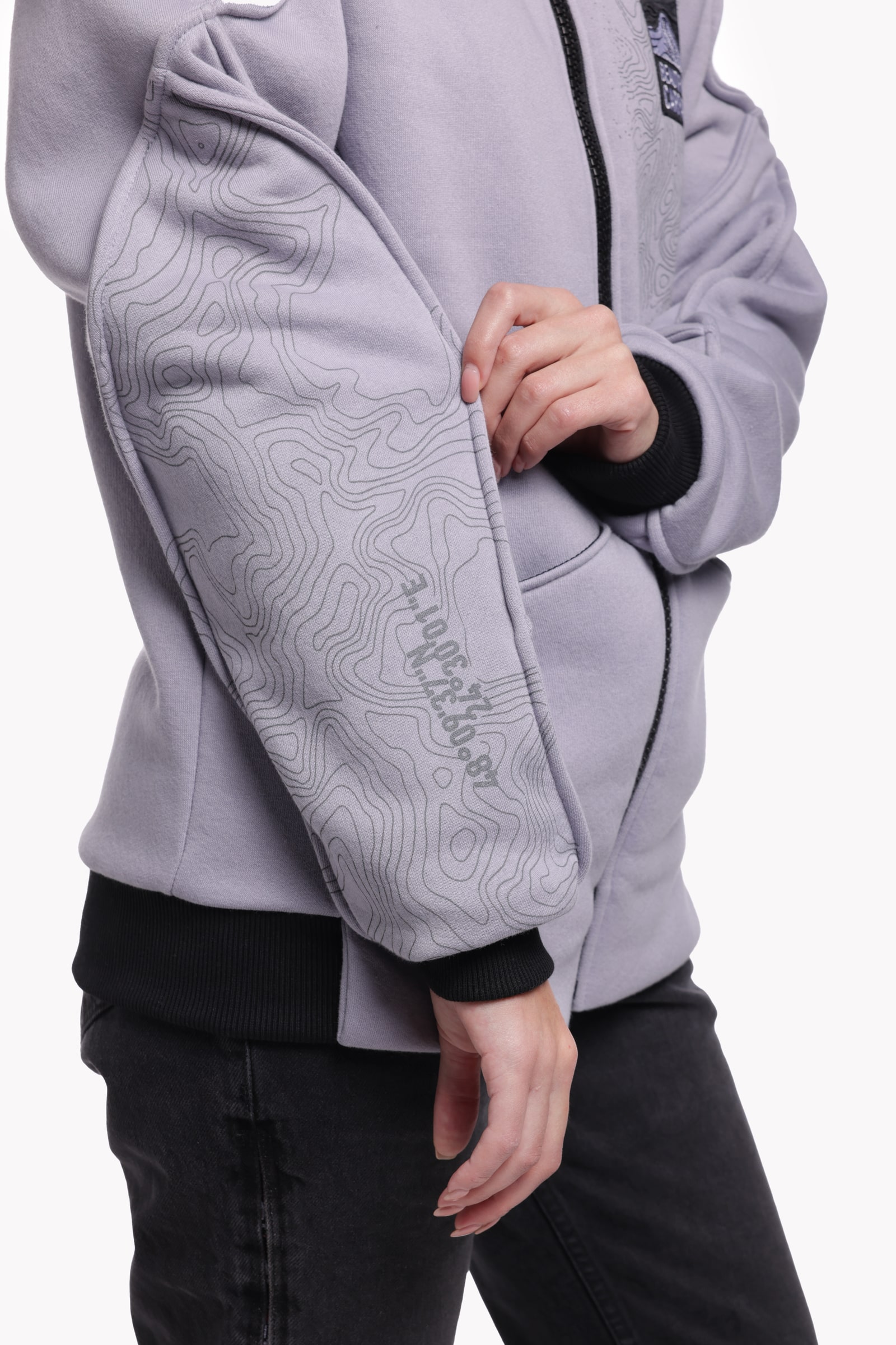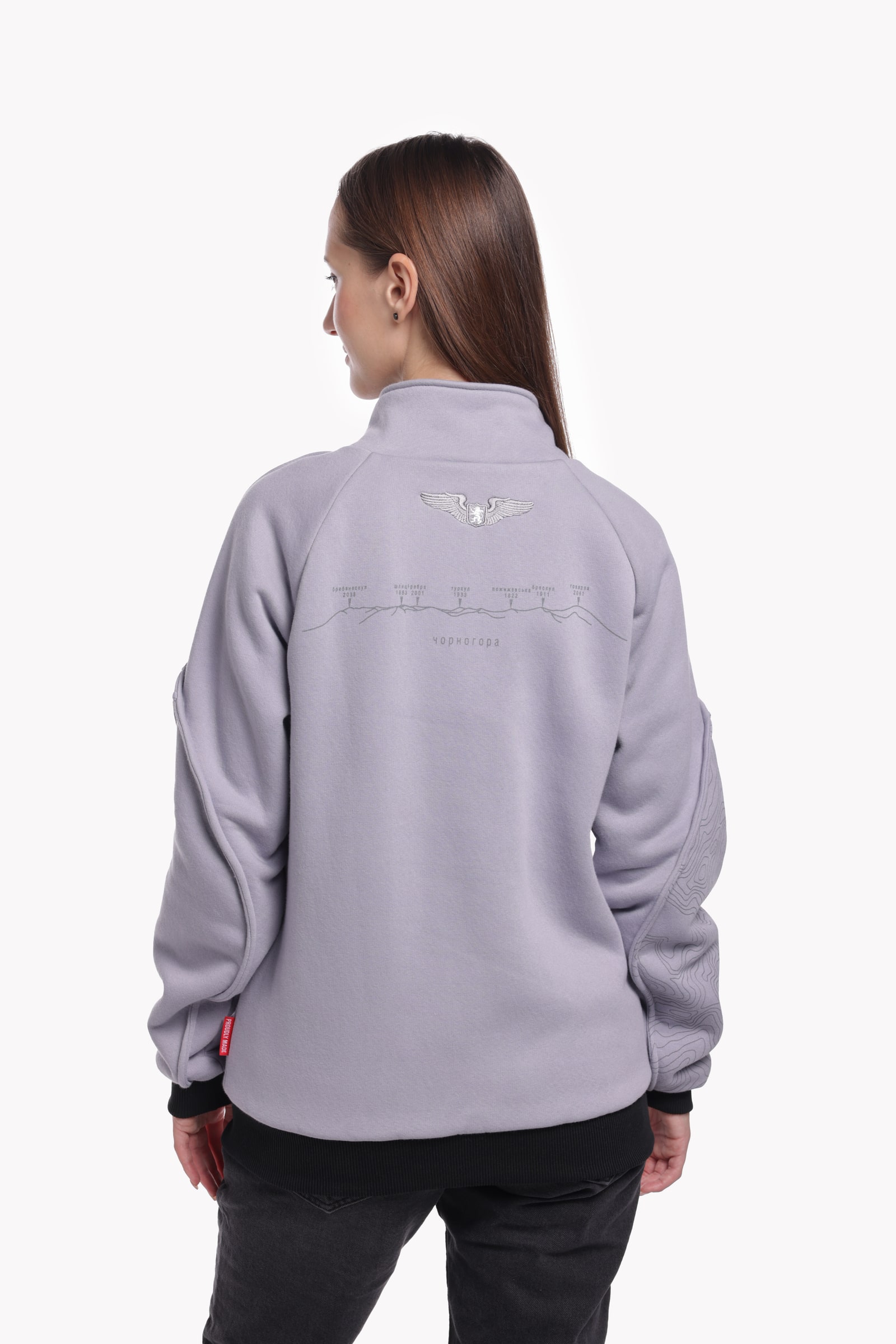 Obszerne szwy rękawów przypominają grzbiety Czarnohory – ich relief jest dosłownie wszyty w konstrukcję. Pomiędzy nimi znajdziesz nadruki ze wzorami karpackich szczytów oraz współrzędne u podnóża Howerli — żebyś nawet w miejskim zgiełku nie straciła swojego kierunku.