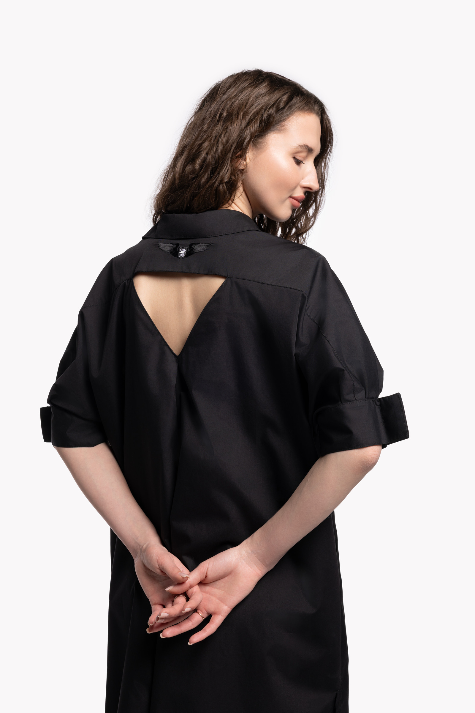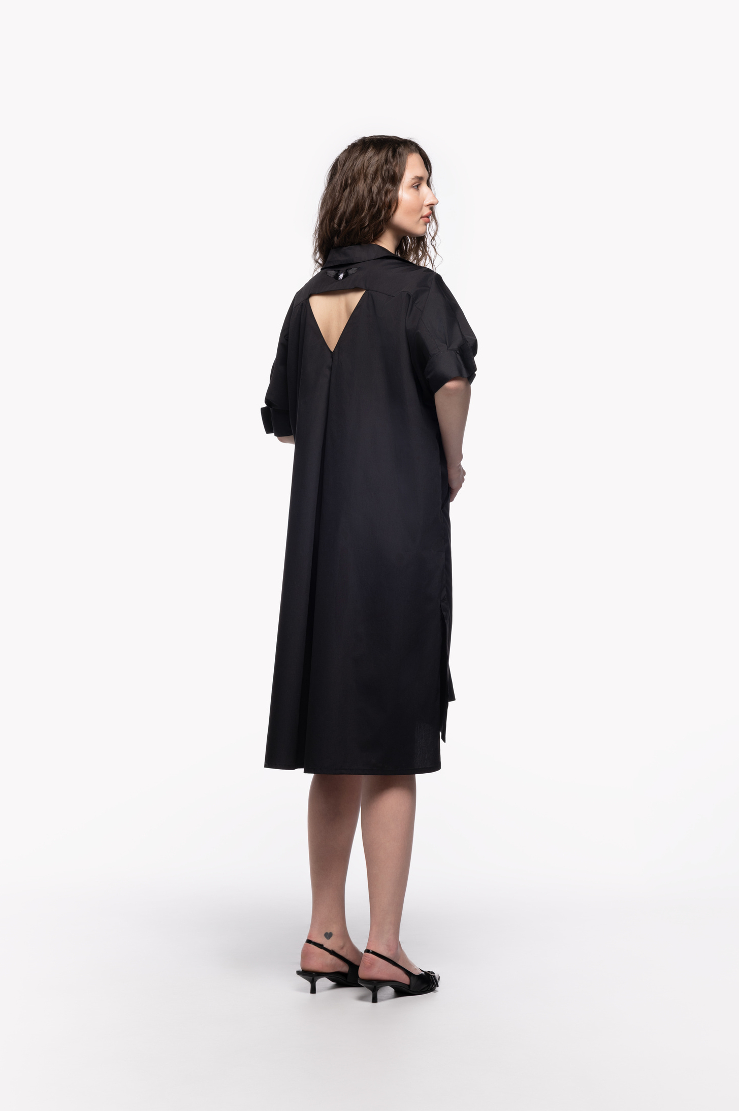 Чорна сукня міді вільного крою, тому в ній не буде спекотно, але при цьому вдяганка тримає форму. Вона не обмежує, а підкреслює свободу бути собою та рухатися у власному ритмі.