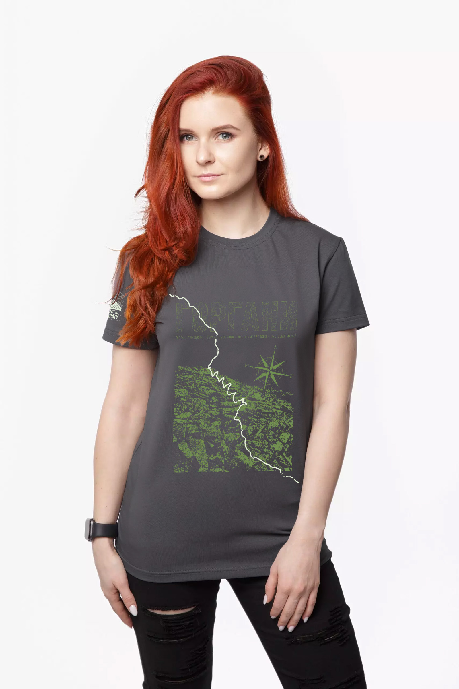 Цим усім нас і привабив могутній масив та ми перенесли його частину на одяг. Ця жіноча футболка – ніби можливість взяти з собою частинку гір: твердість і гармонію, справжність і впевненість. Відгукується? Тоді футболка Горгани – для вас!