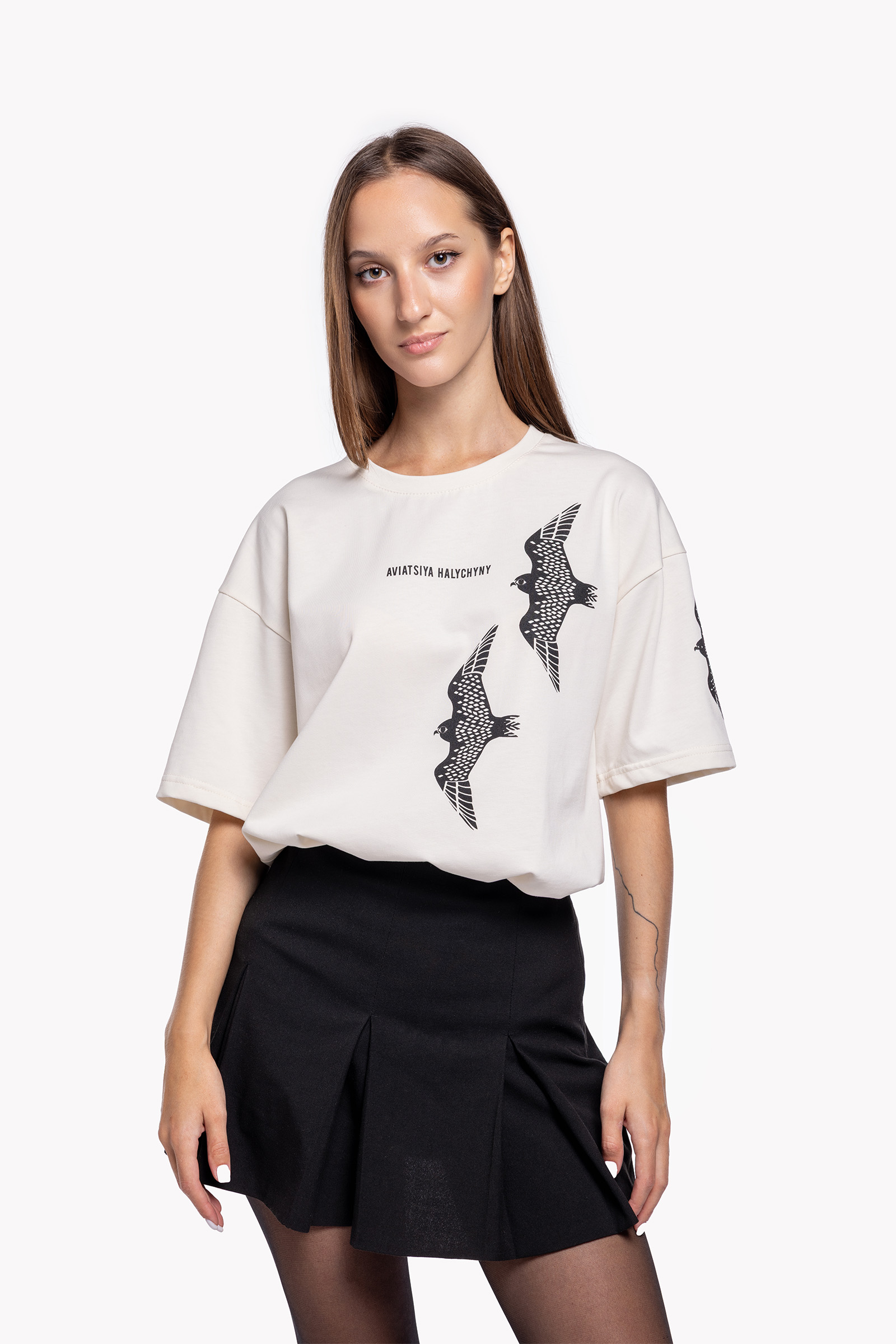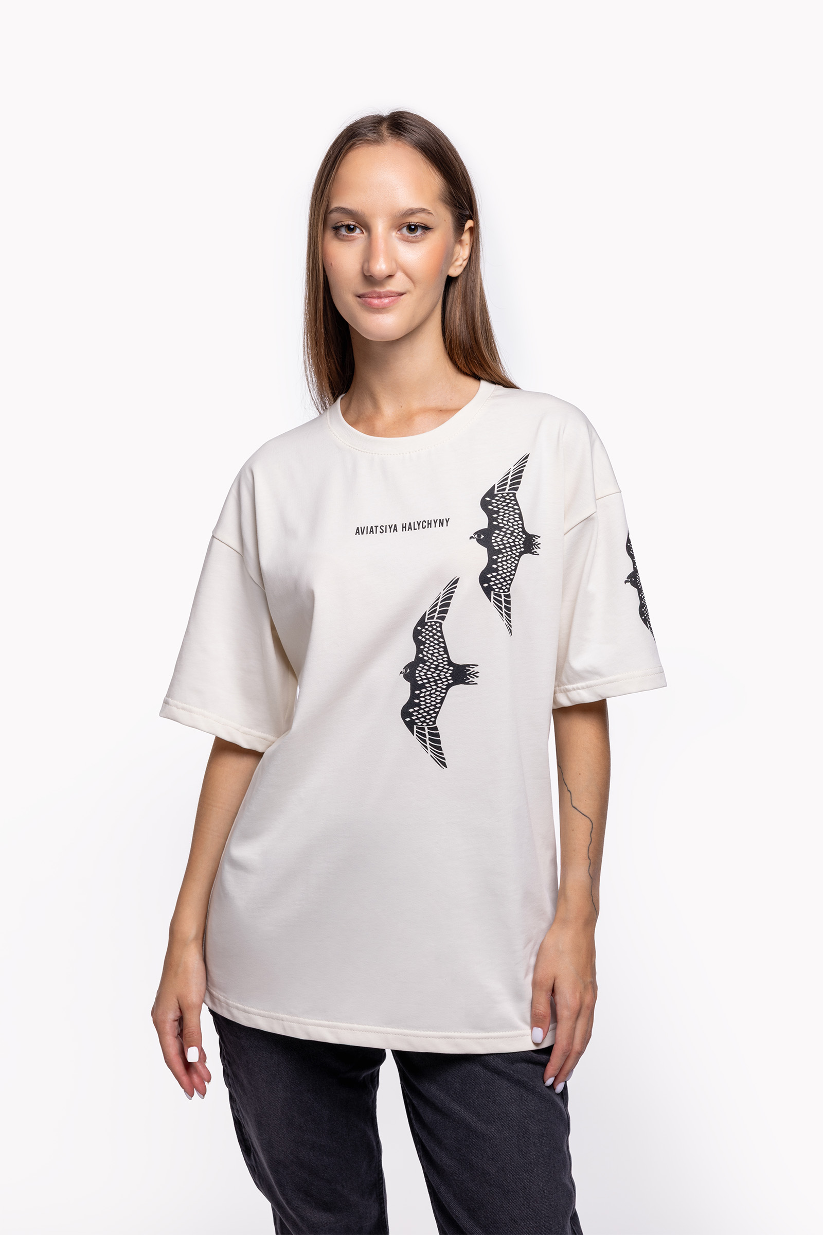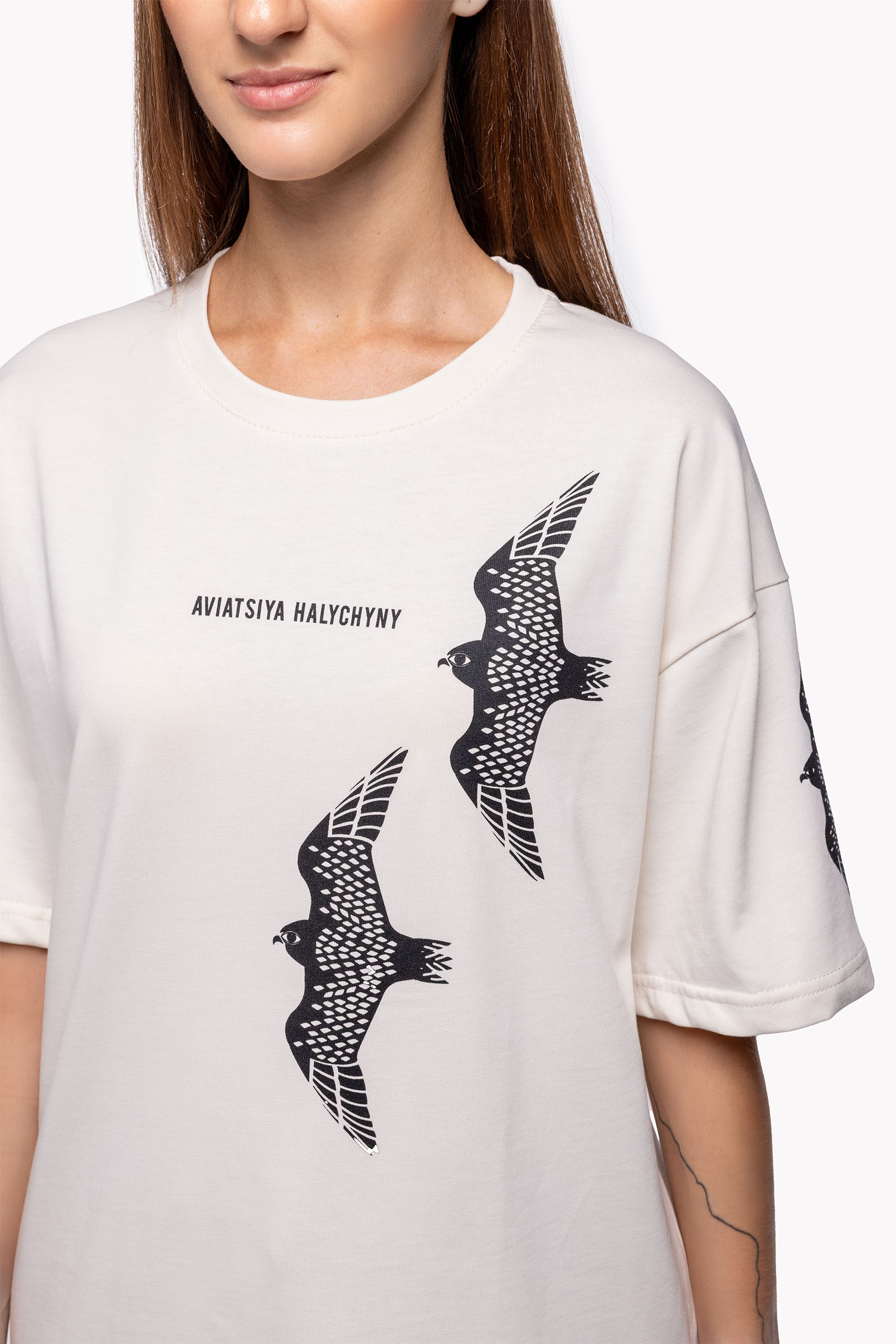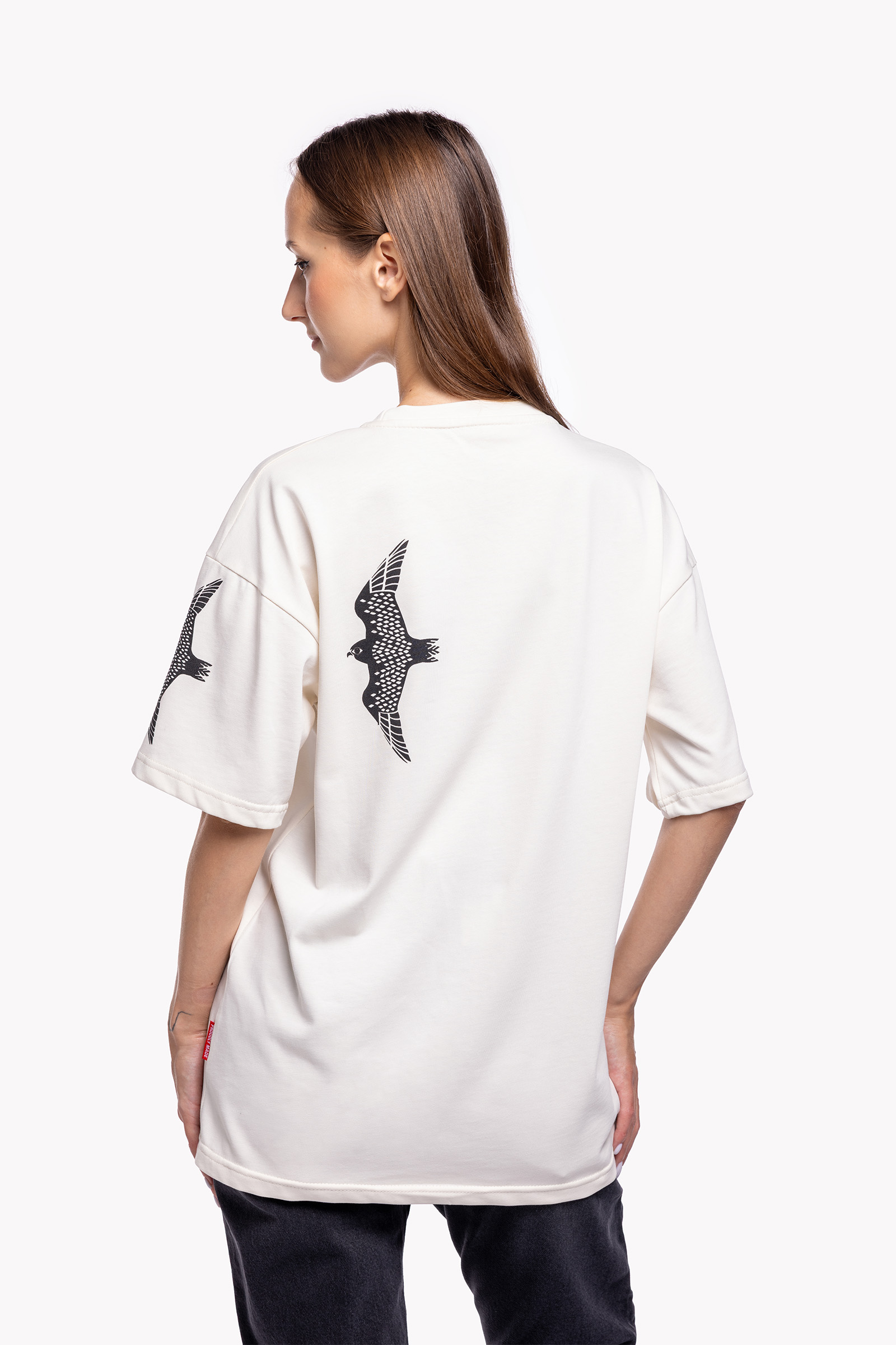 Вона виконана у мінімалістичному стилі, адже принт із птахом говорить про її символізм сам за себе. Футболка має вільний крій, аби ви також могли почуватися в ній вільно, як той сокіл у небі. Тканина тут цупка, тому добре триматиме форму.